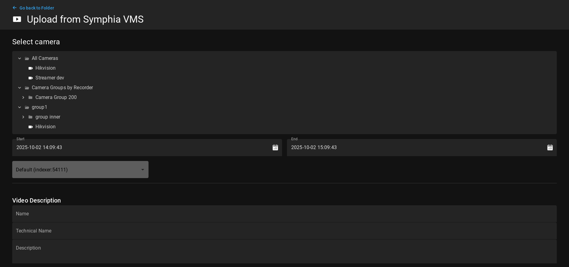 Here you can select the camera to import a video segment from. Select a a time range and the Indexer that will process the video. Fill in the video description details and review its Analysis parameters.